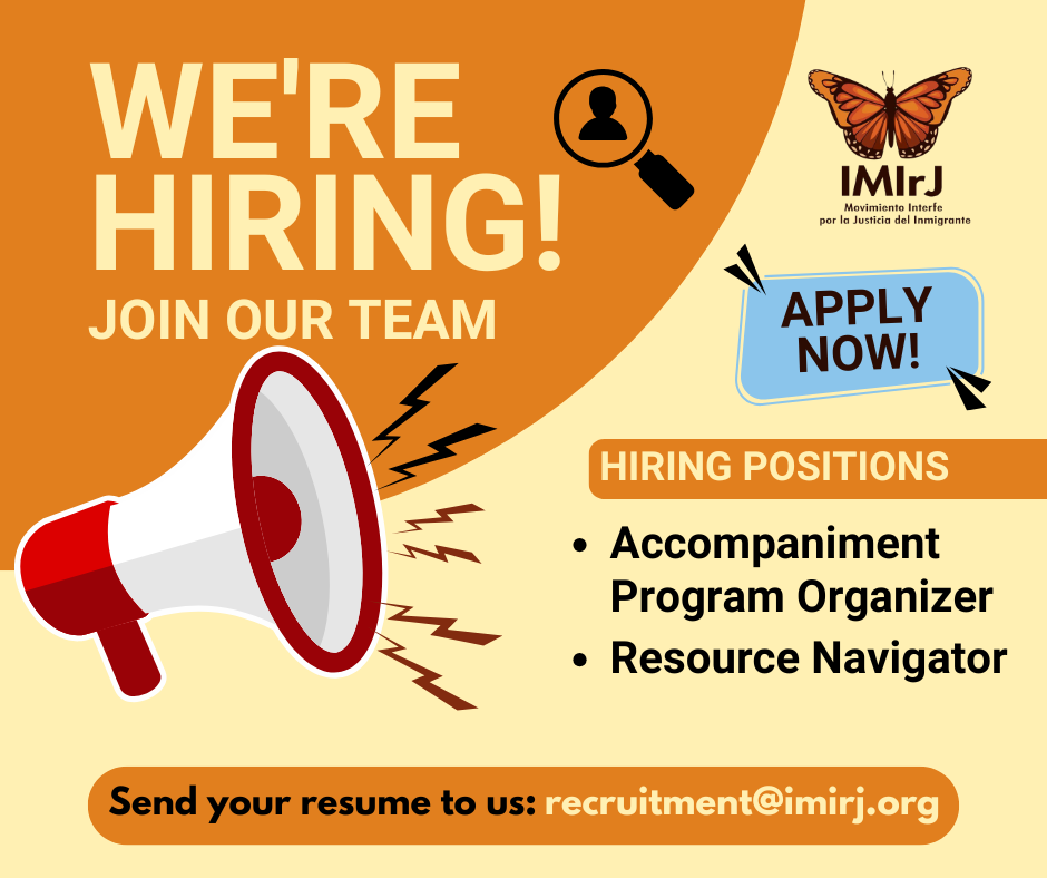 IMIrJ is seeking a full-time Accompaniment Program Organizer (APO) to support the Accompaniment Coordinator and report directly to the Executive Director. This person will support day-to-day tasks and work towards major goals and objectives for the program. They will cover the program when the Accompaniment Coordinator is off, being part of a larger tapestry of migrant rights organizing. The Program Organizer has to have awareness and sensitivity for diverse cultural experiences and be skilled at supporting and inviting people to walk alongside migrants.